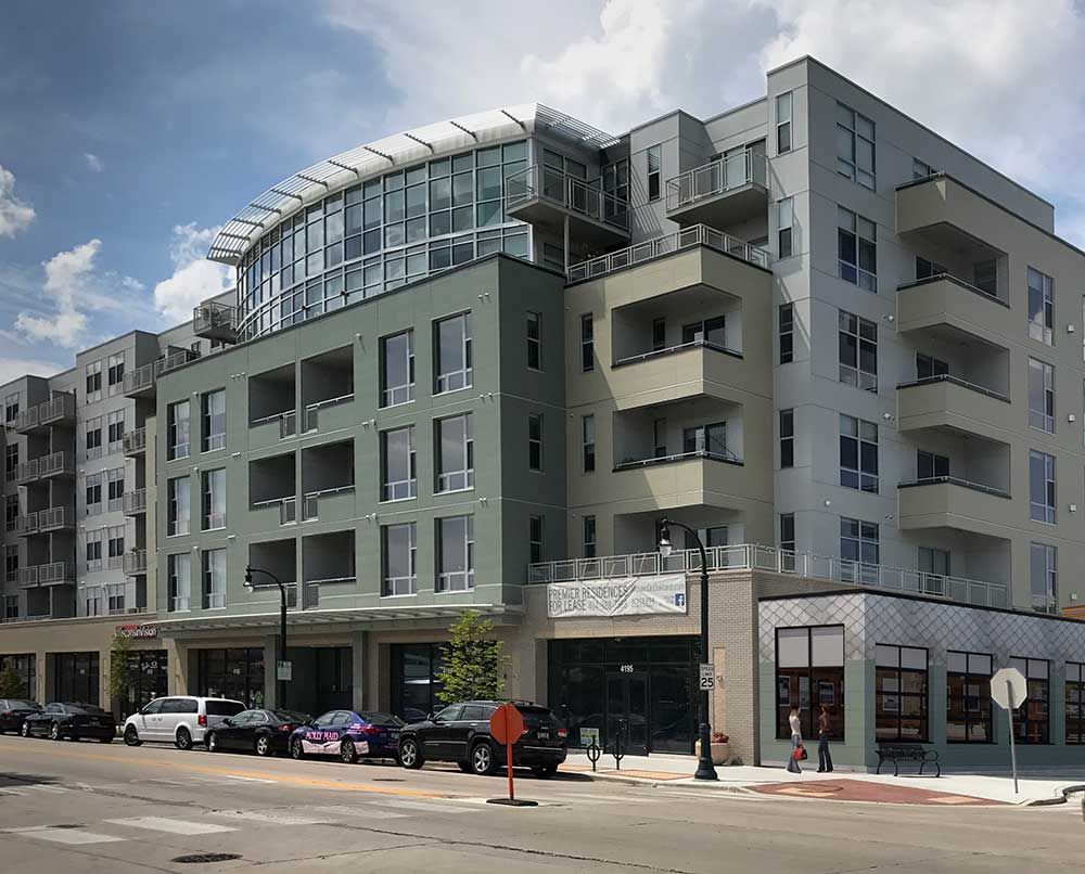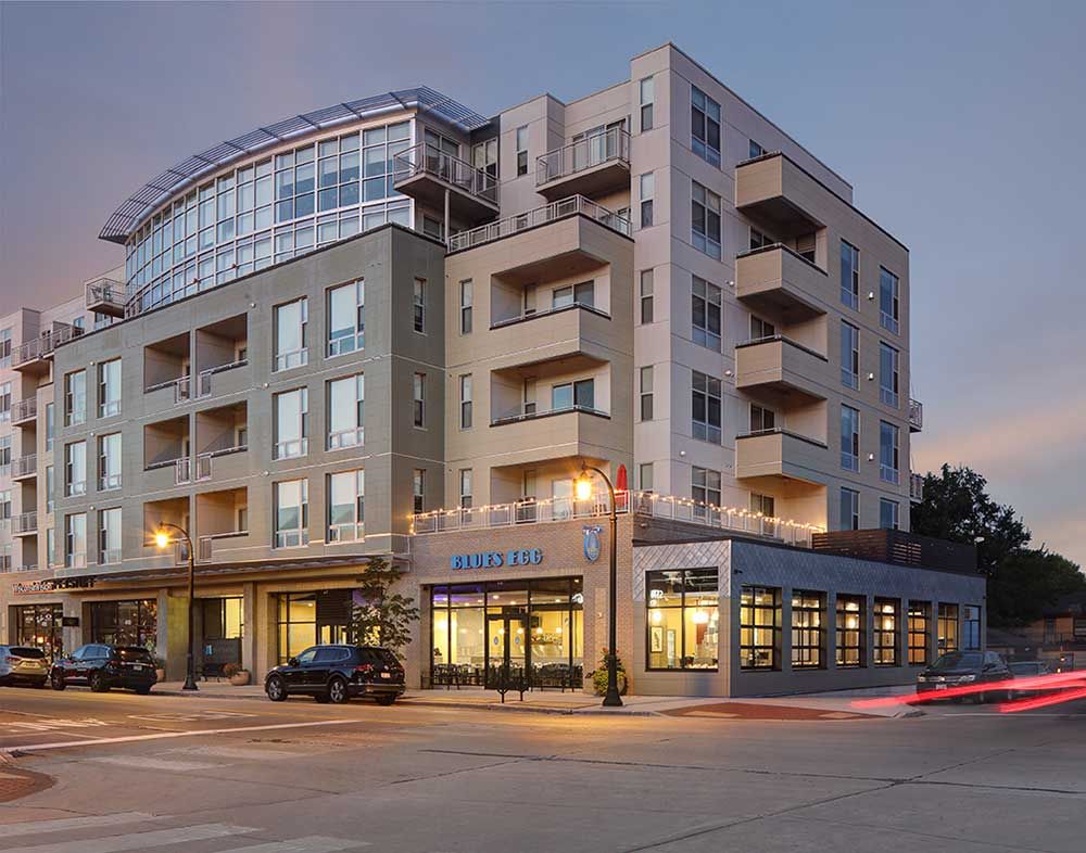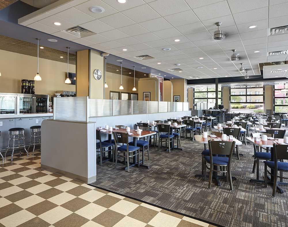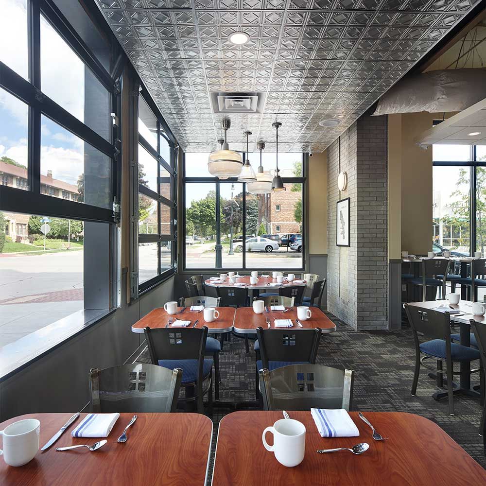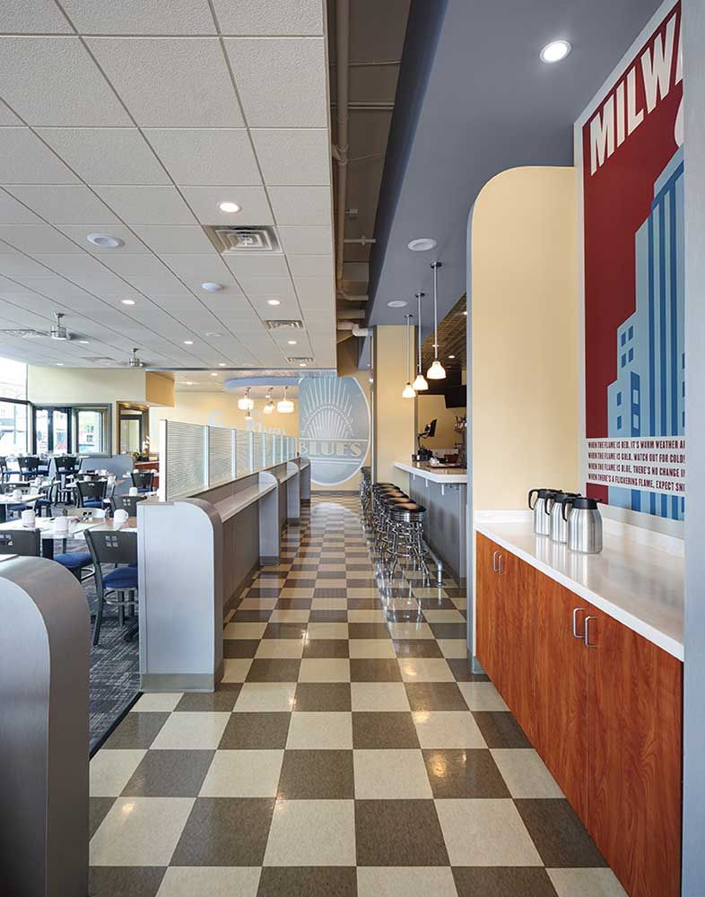(4,500 s.f. restaurant alteration & addition) Working with the tenant (Black Shoe Hospitality) and the landlord (General Capital) is a highly cooperative manner we replaced an underutilized exterior patio with a restaurant dining area to expand the restaurant area for the new Blue’s Egg in the Village of Shorewood’s Oakland Avenue business district. The entire project encompassed 4,500 square feet of renovation and expansion area. Large overhead glass and metal garage doors enhance the morning and brunch dining experience in this urban environment.