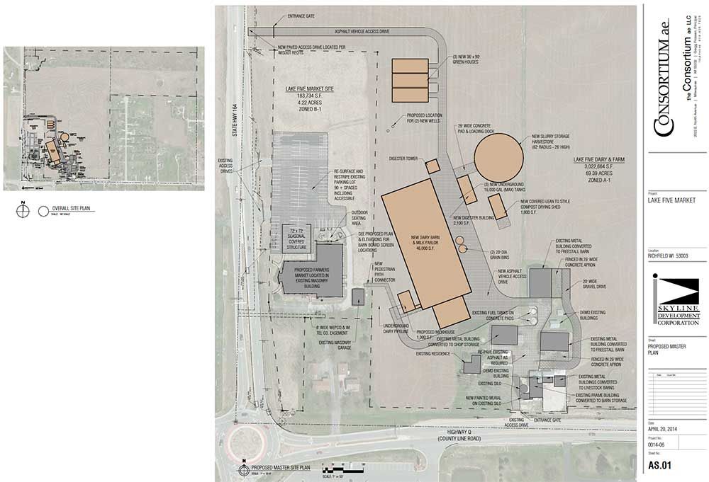 Lake Five Dairy & Market, Washington County, Wisconsin: This Cow to Consumer Dairy is the brain child of Kurt Schwendimann and the Schwendimann Family. The 250 working head dairy features a world class cow & bull, as well as robotic milking machines and a manure-to-energy digestor. The adjacent greenhouses will be used to supply a re-purposed creamery, farmers market, deli and farm grocery on the public side of this operation. C a/e did the master planning for the dairy & market as well the design and engineering for the market.