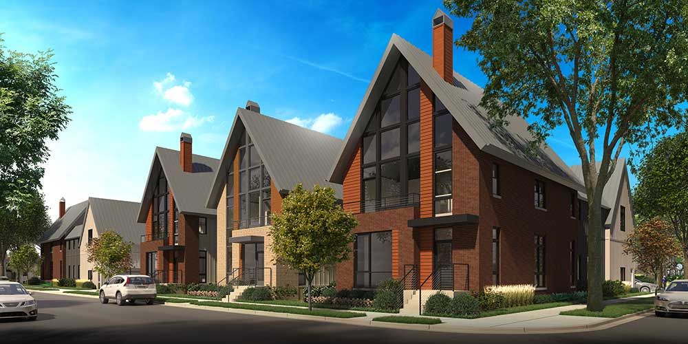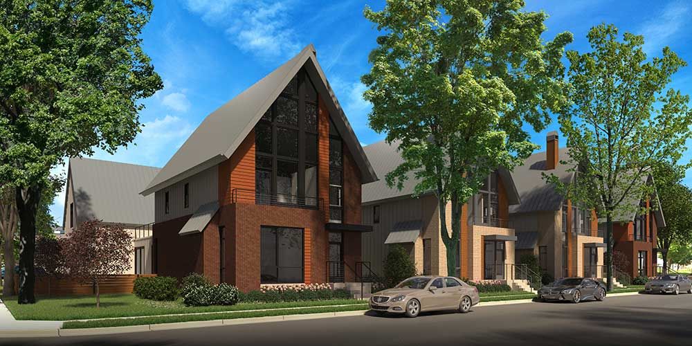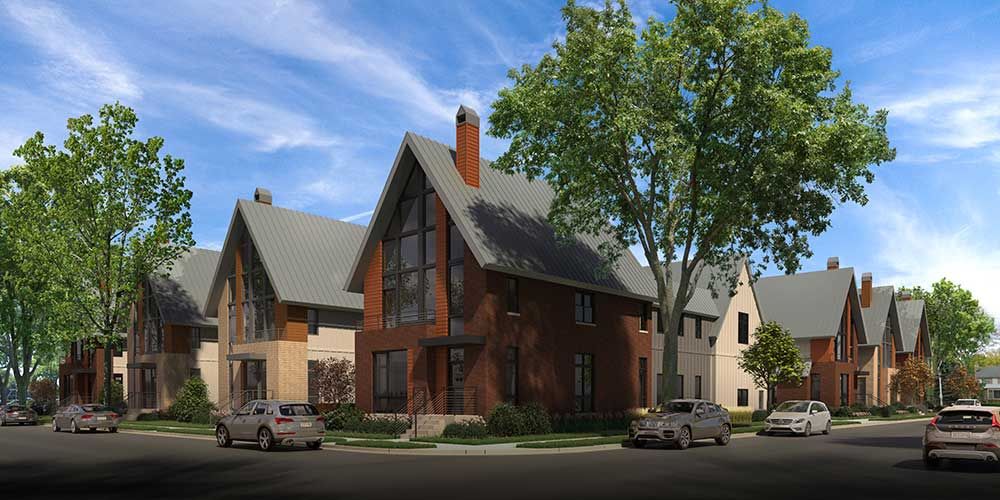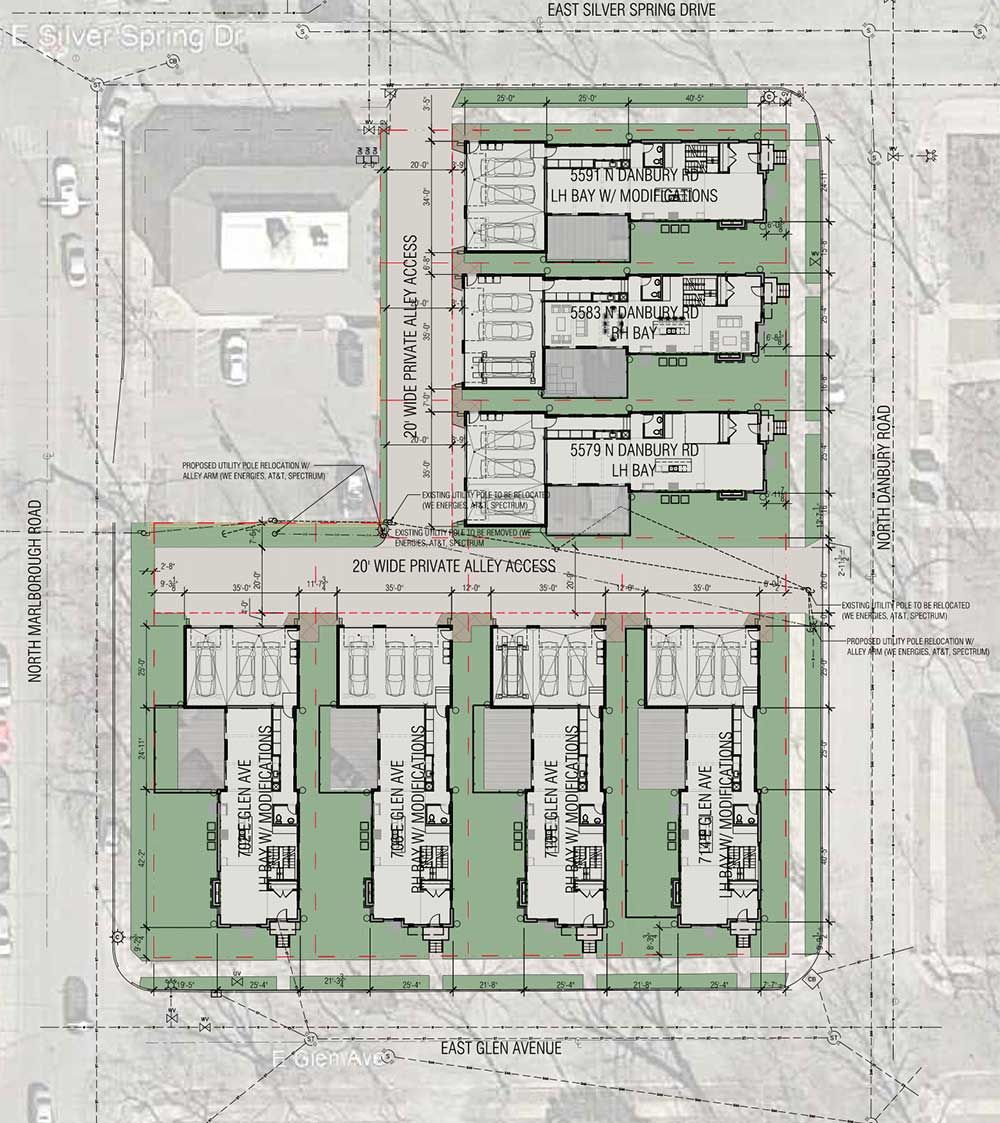 (single family home redevelopment project) The site is a former urban church located on the edge of this urban Village just north of the City of Milwaukee, blocks from Lake Michigan. Seven, three story single family homes, taking their design ques from contextual homes and developments in the area replace a large surface parking lot and house of worship. The homes share typical urban alleys with garages connected to the main living spaces via conditioned “breezeways”. Construction is anticipated to start in 2020.